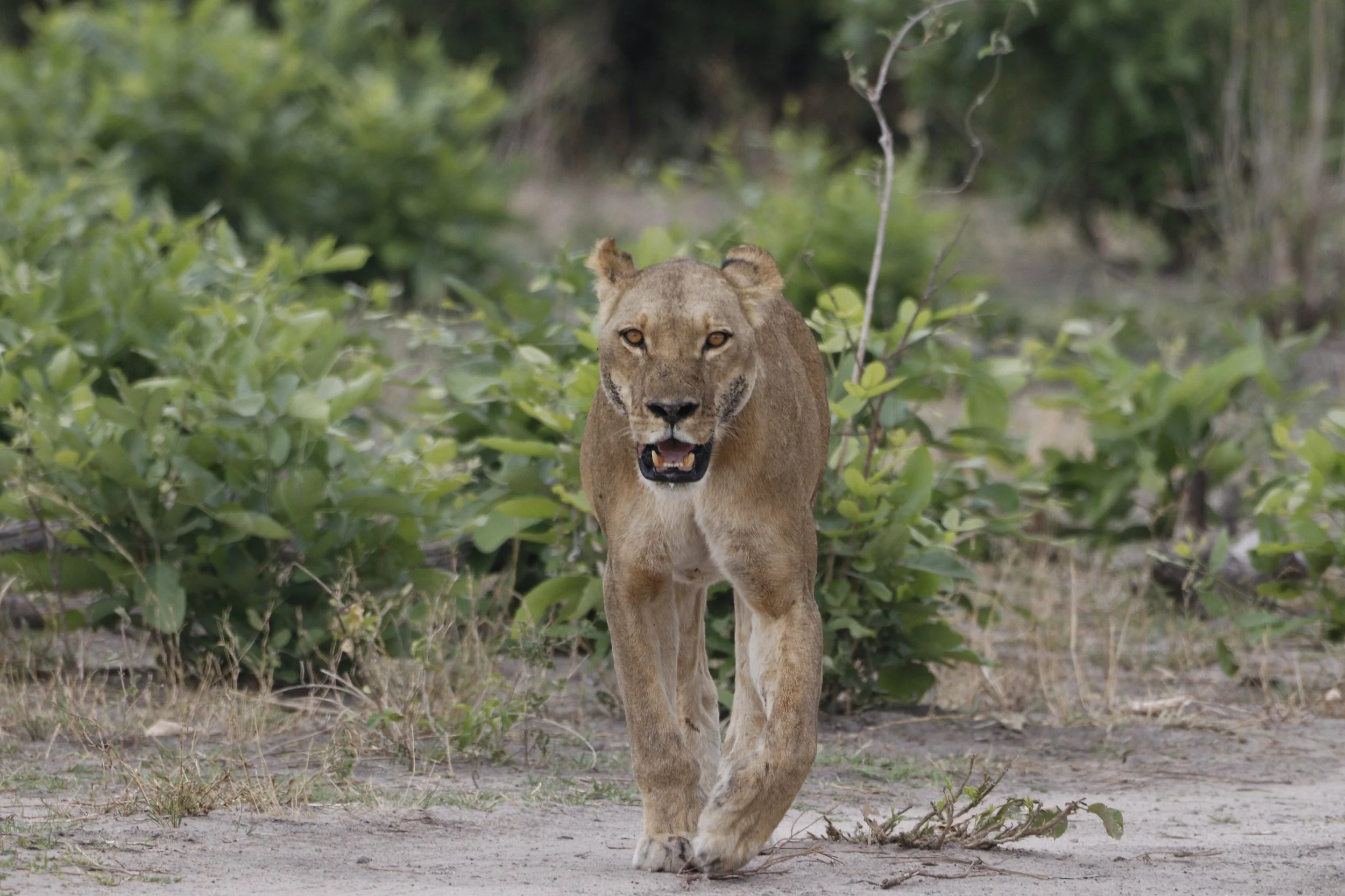 And there, about 7 metres from the car, emerging into my view from behind a bush, on the path that we had been using to walk up to the toilet block and go to look at scenes on the river, was a lioness. And then another following it.
